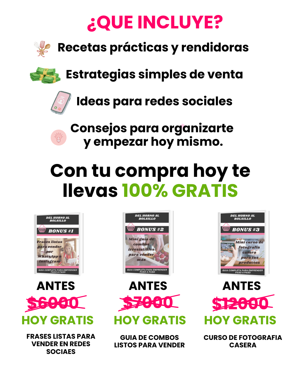 No solo trae recetas fáciles, sino también tips de venta, estrategias simples y bonos exclusivos para ayudarte a emprender.